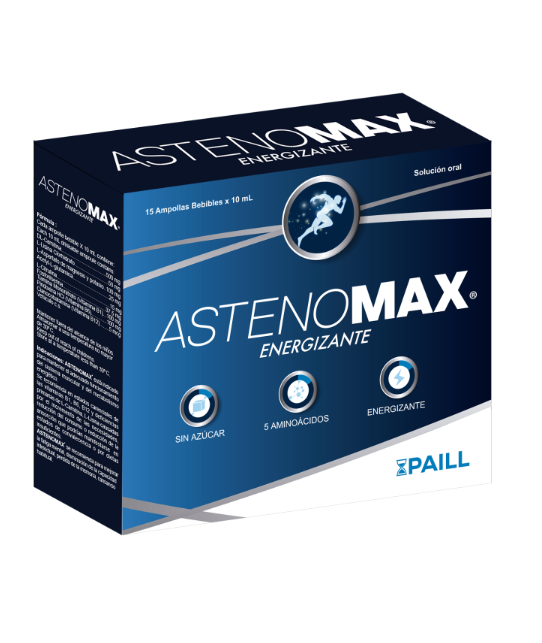 ASTENOMAX is an energizing supplement with essential amino acids and neurotropic vitamins formulated to support muscle function and energy metabolism. Pack size: box with 15 drinkable ampoules of 10 mL. Route of administration: oral.